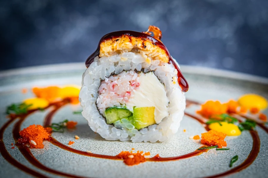 Angerjas, lumekrabi, avokaado, kurk, seesamiseemned, unagi kaste, kreemjuust. Allergeenid: kala, piim, seesamiseemned.